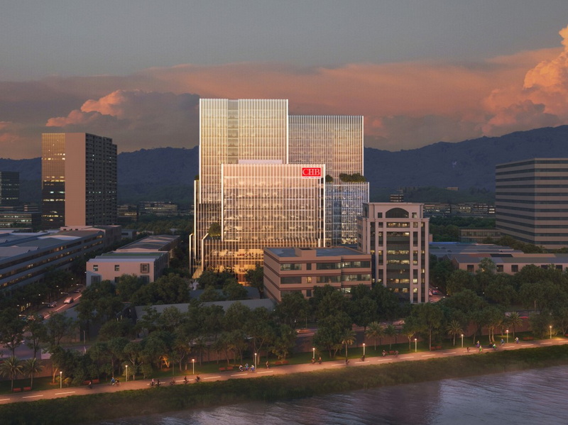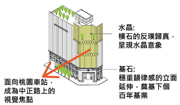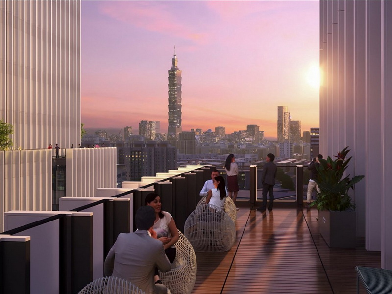 本基地縱深極深而沿街面不長,地勢由北側基隆河往南側虎山逐步高升。為創造各棟建築物視野及增加棟距,平面採位置錯動方式配置,並結合法規退縮及”Cash Pile”之設計構想,造型上量體錯置以提供公用露臺及生態跳島,並形成入口中軸線及內部生活廣場。本案並以標誌性、連接性、靈活性及永續性為設計目標。